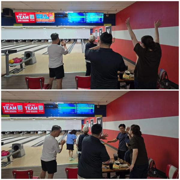 교회 체육회 멤버들과 함께하는 토요일 밤 볼링 매치.