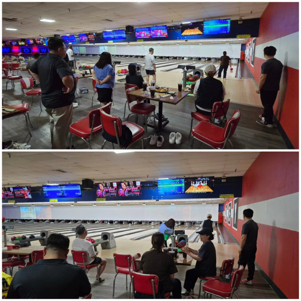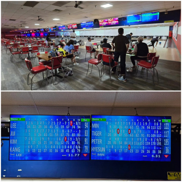 교회 체육회 멤버들과 함께하는 토요일 밤 볼링 매치.